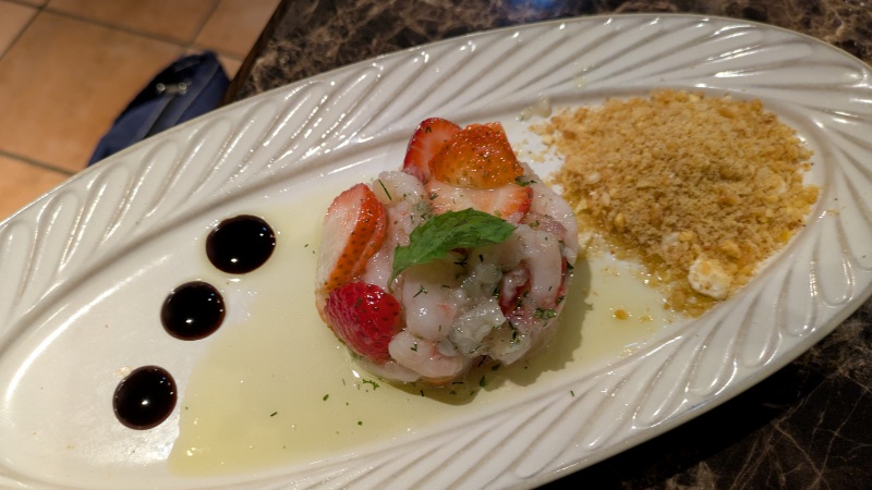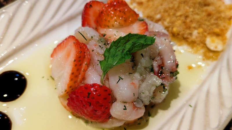 海老単独でも、苺単独でも、合わせて食べても、さらにバルサミコソースやナッツをかけたりと、味や香りを変化させながら楽しめる一品でした。