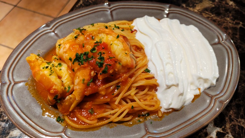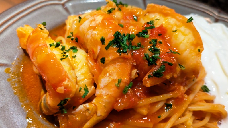 ぷりぷりっとしてしっかりとした食感の海老が三尾も乗っているパスタ。