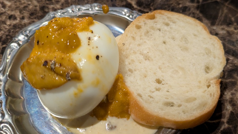 ゆで卵にマヨネーズ、これだけだとマヨの酸味が尖がってしまうのですが、ウニが入る激変!