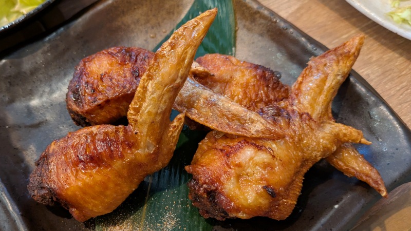 丁寧に骨を抜いた手羽先、その中に餃子の餡を詰めて揚げています。