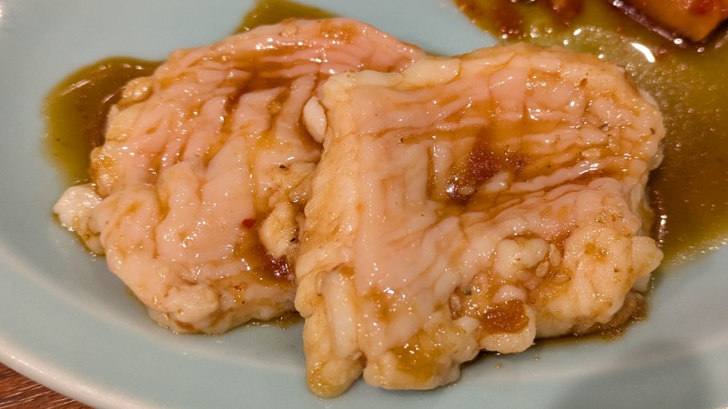 焼いた後でもお箸で持つとプルプル、そして食べてみるとジューシーさがあり、ホルモン独特のコリコリっとした食感もありました。
