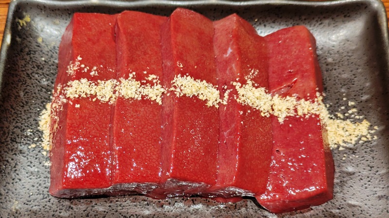 でもホント、そんな感じの名前があってる!って思うくらい、お箸で持つとプルプルで、コクがあって旨味がしっかりのレバーでしたよ。