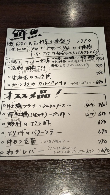 通常メニューに加えて、今日のおすすめメニューもあり、テーブルの上に置いてありました。